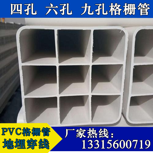 九孔格柵管最明顯的特點就是有九個孔,一般分為兩種,大九孔和小九孔。九孔格柵管的規格是9-33/107 9-28/92。九孔格柵式方孔管是集護套與子管為一體,一次擠壓成型 造型美觀采用PVC工程塑料制作抗壓強度高重量輕使用壽命長內壁光滑磨擦力小施工方便可抵抗外力影響保護光、電纜的功能。九孔格柵管內孔近似方格型 ,有效空間大,便于穿光、電纜。