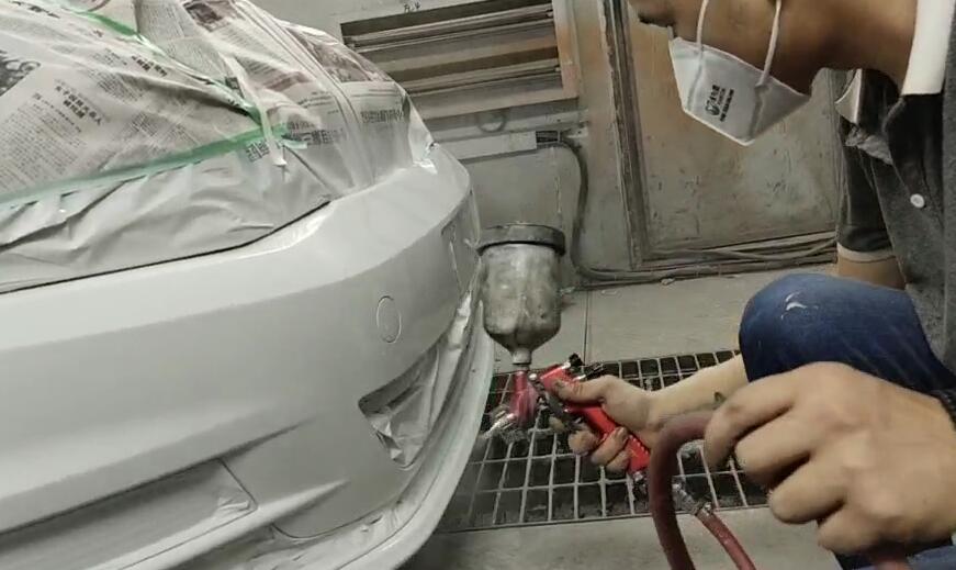 (6)噴面漆。在用元鐵氣動(dòng)噴槍進(jìn)行噴漆的過(guò)程中,每一道漆層的噴涂都應(yīng)該超出前一層漆層,并且還不能大于水磨區(qū)域,對(duì)于最后~到噴漆處理則可以適當(dāng)添加一些稀釋劑含量,并且采用環(huán)形動(dòng)作來(lái)進(jìn)行移動(dòng)噴槍噴涂,或者是由修補(bǔ)的中心向外部采用短促的動(dòng)作來(lái)進(jìn)行噴涂。