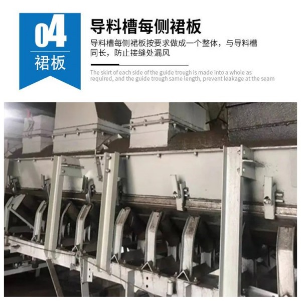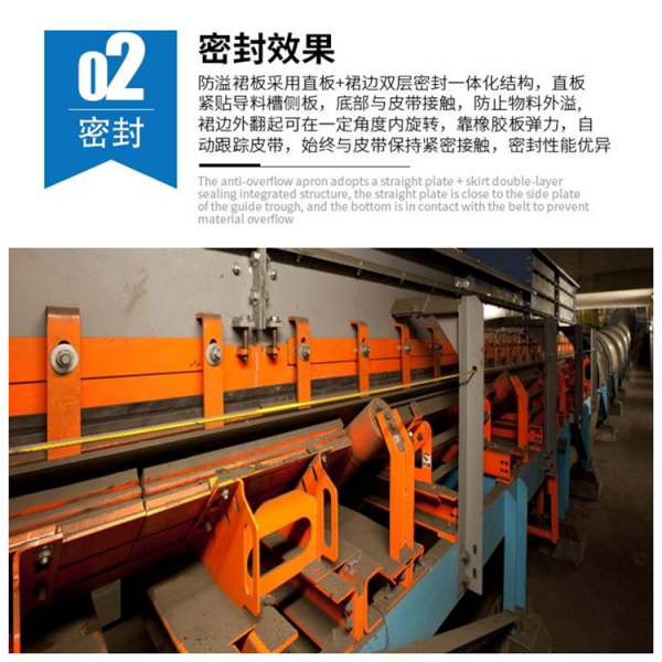 導料槽防溢裙板為雙層結構,通過一套快速壓緊裝置安裝在皮帶機導料槽的下沿,用于輸送帶與導料槽之間密封。