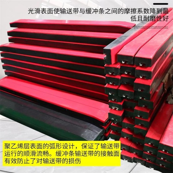 緩沖條是用于輸送機的進料口處,替代傳統的緩沖托輥,高能吸收和低摩擦地緩解進料端落料的沖擊力,輸送條和輸送帶的面接觸有效防止了對輸送帶的損傷。