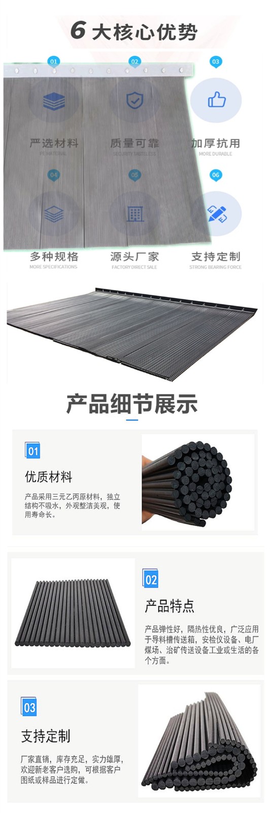 6mm橡膠擋塵簾是一種廣泛應用于煤礦、電廠、水泥廠等場所的防塵設備。以下是對6mm橡膠擋塵簾的一些詳細介紹: