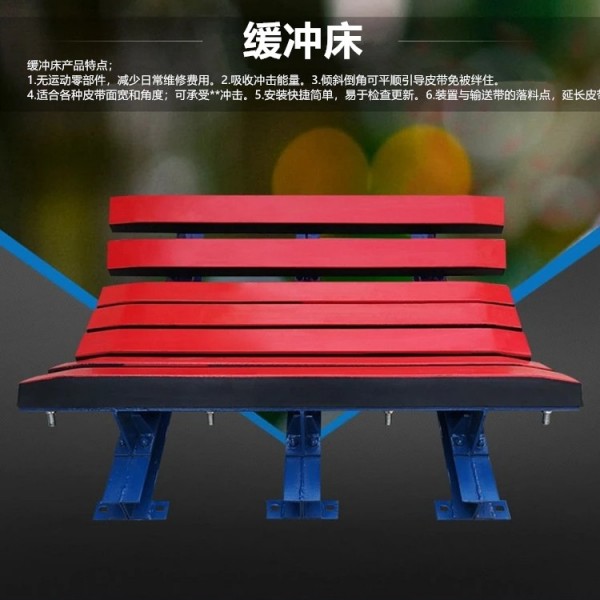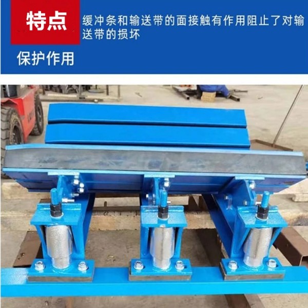 傳統(tǒng)礦用緩沖床由于無(wú)法解決大塊物料、矸石對(duì)緩沖床的巨大沖擊,常常導(dǎo)致帶式輸送機(jī)皮帶帶面磨損嚴(yán)重甚至劃傷,目前傳統(tǒng)礦用緩沖床只在緩沖條上做文章,通過(guò)調(diào)節(jié)緩沖條耐磨層和緩沖層對(duì)緩沖效果及耐磨效果進(jìn)行調(diào)節(jié),但不管調(diào)節(jié)耐磨層還是調(diào)節(jié)緩沖層都無(wú)法從本質(zhì)上解決帶式輸送機(jī)傳統(tǒng)緩沖床的抗沖擊缺陷